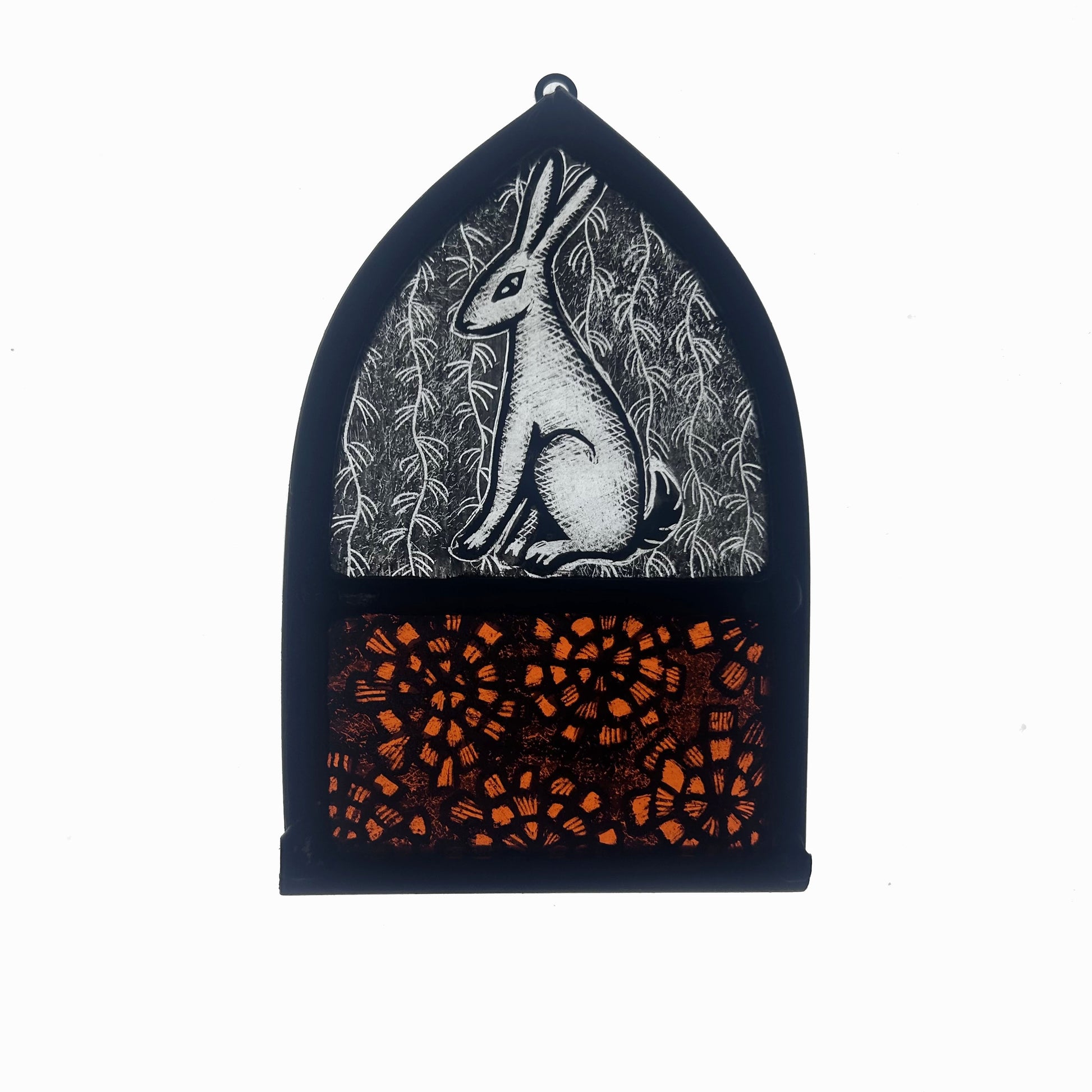 Hand painted sitting hare on clear glass with orange marigolds. Comes ready to hang with a copper hook on the top